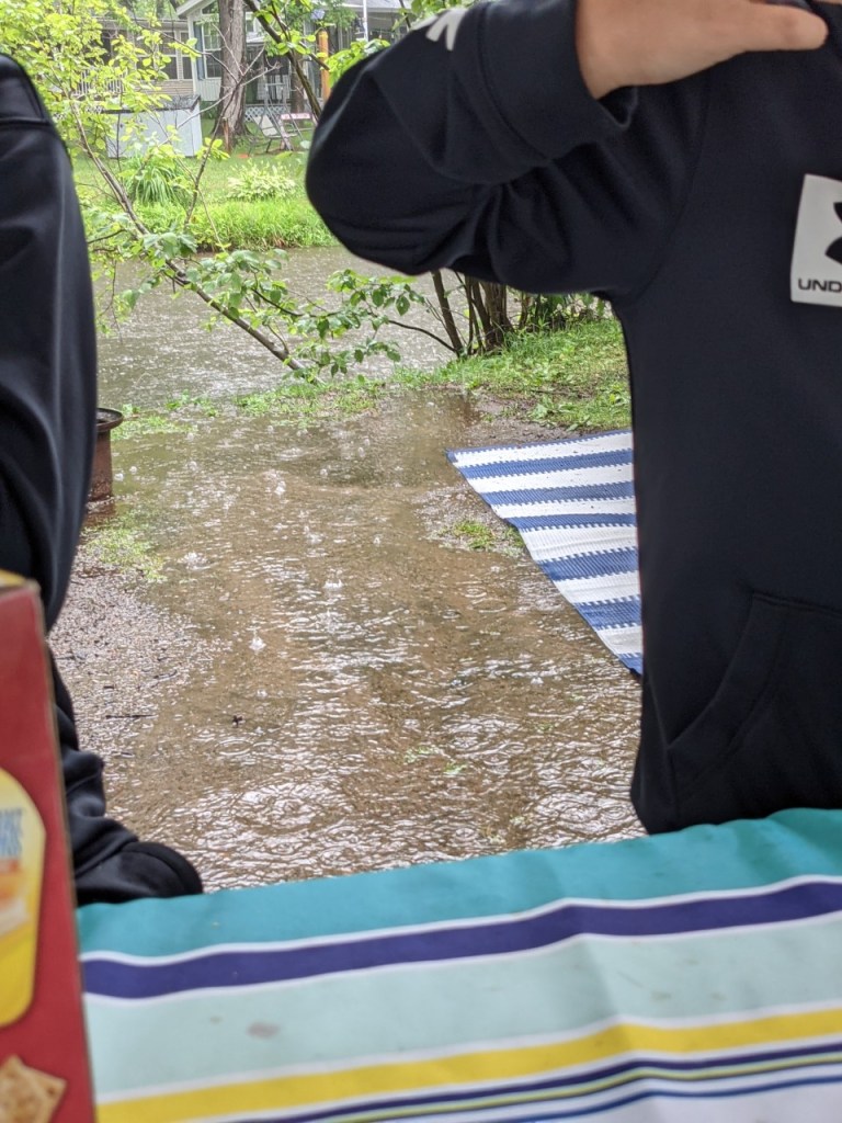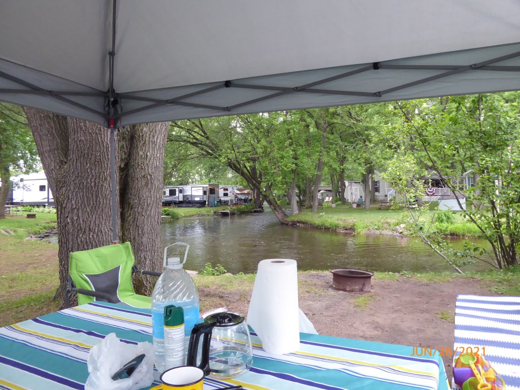 Saturday started out ok but then the rain started. It was a good thing the tent was up over the picnic table. It gave us some place to sit out of the rain. And boy, did it rain! We had a little river flowing thru the camp site