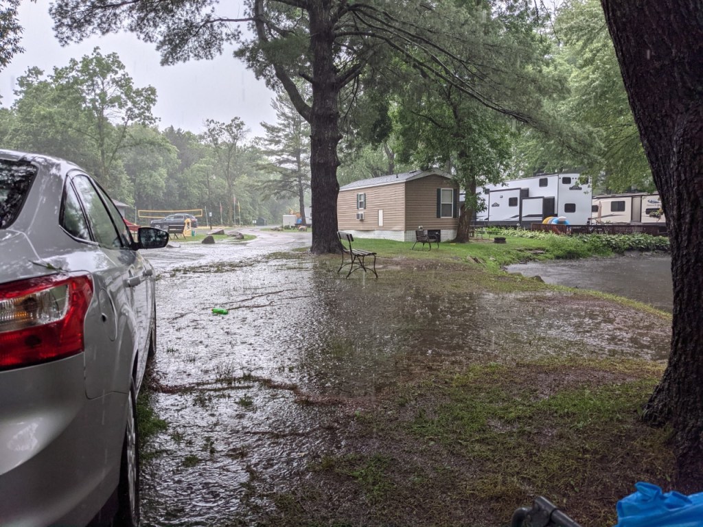 But you know what, people don’t let that stop them from having fun. The campsite had some activities scheduled for the kids. One of them was water fight. You were supposed to grab whatever water apparatus you could find, be that water balloons, water guns, buckets of water…whatever. Then you were suppose to be out by the playground at a certain time. Then a few of the teenagers that worked there got in a work truck and they drove around the playground throwing water balloons, squirting squirt guns etc. and then the kids tried to get them wet and anyone else who was around them. It didn’t matter that it was raining buckets. Everyone had a great time.