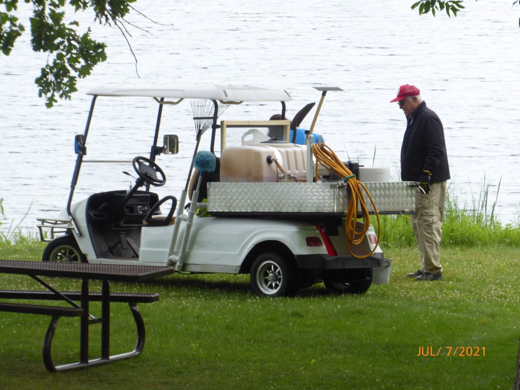 We ran into these two while we were out walking the trail. Do you see that tank in the back of the golf cart? See how dirty it is? At our marina in Minnesota, they pump out peoples boats using a golf cart with a big tank on the back, so you can imagine their confusion when I asked them if they were a portable pump out