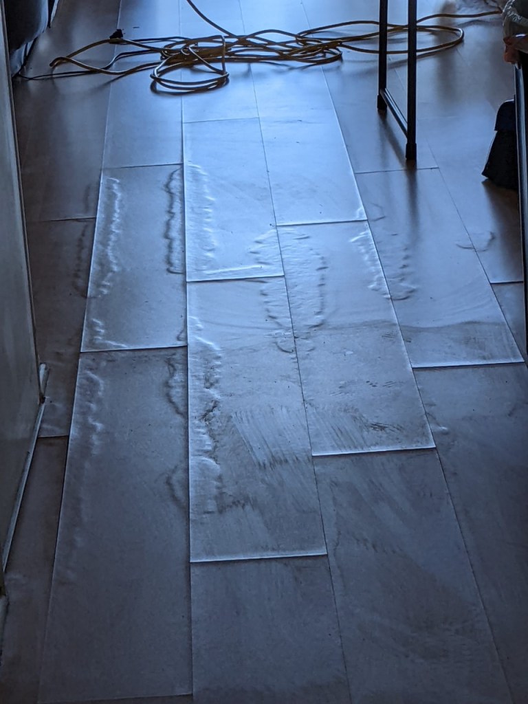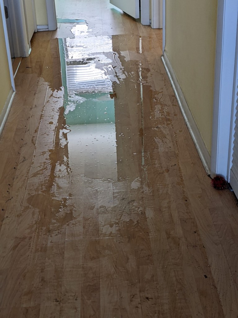 So anyway, back to the story. After we got the floors vacuumed, you can see what the water did to the flooring. The funny part was we were looking to replace the flooring last spring but decided to wait. I’m glad we did.