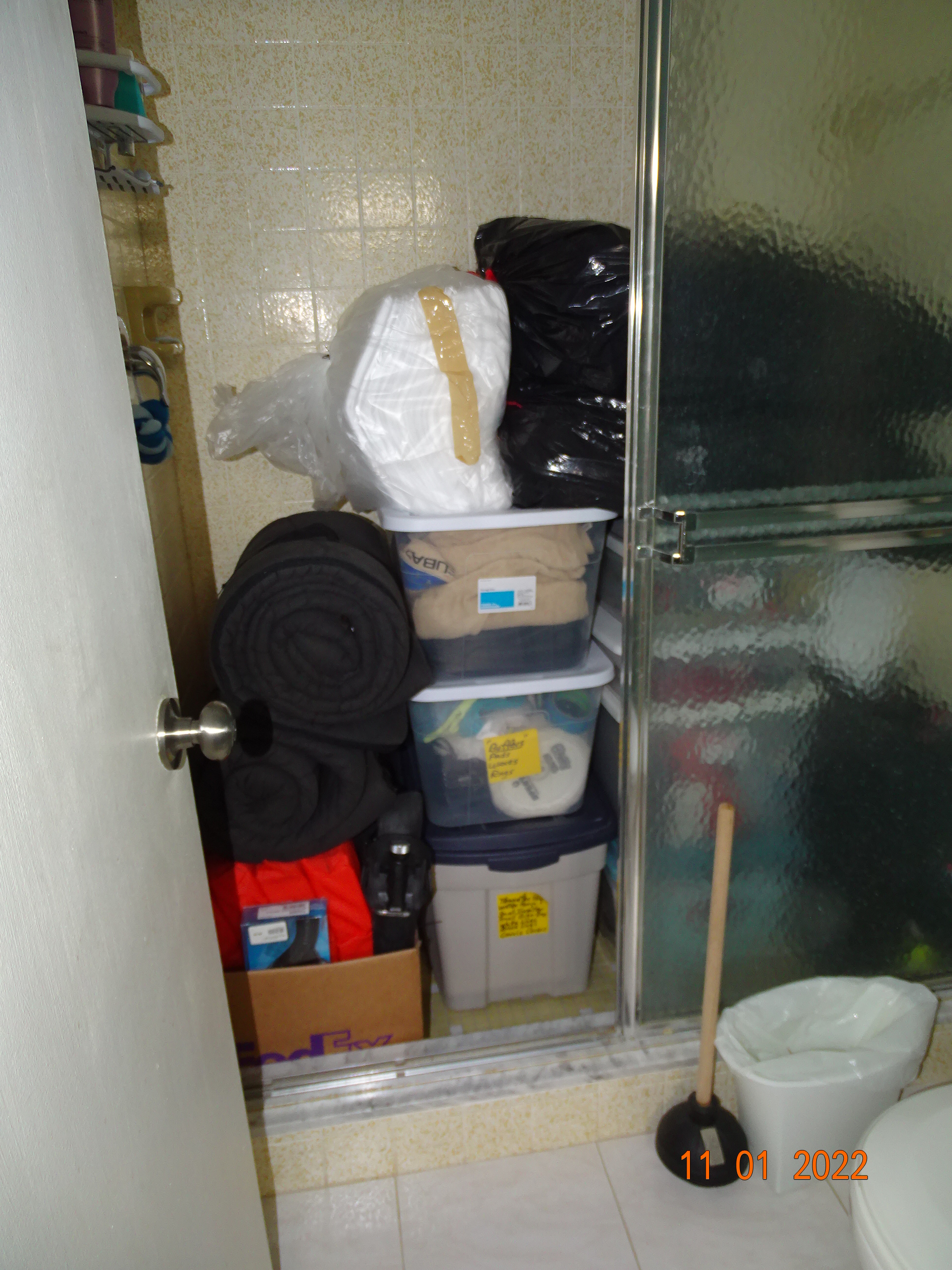 We had to get everything out of the closets and up off the floor for both the fumigating and when the new floor would be laid. The shower and tub held a surprising amount of stuff.