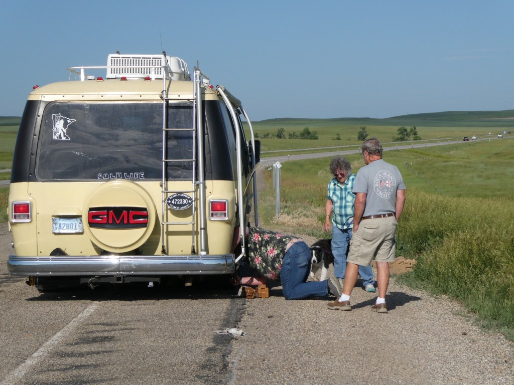 I didn’t see anyone standing outside but he did have his dump hose attached to his RV. I figured he was sitting in his truck while it dumped. Gary knew…..that is why he is standing outside of the car. See the guy with the dog in the right side of the picture? He is talking to a guy with a garbage bag. I figured they were just shooting the breeze. Turns out the guy with the garbage bag owned the RV. Not only did they talk on the side of the road for a while, but then they both went up to his truck and looked under the hood. Where is the dump site etiquette buddy? After he is finally done chit chatting with Mr. Dog Owner, he decides it’s time to get rid of his trash that he’d been holding onto all this time. “Sorry” he says. Yah, like that helps buddy, I didn’t know this was your own personal dump site. Then he proceeded to un-attach his hose, and then he stuck the water hose down his sewage hose to clean it out. Euw! Other people have to touch that hose. So when Mr. Important finally got done, we could do our dumping. One of the joys of camping.