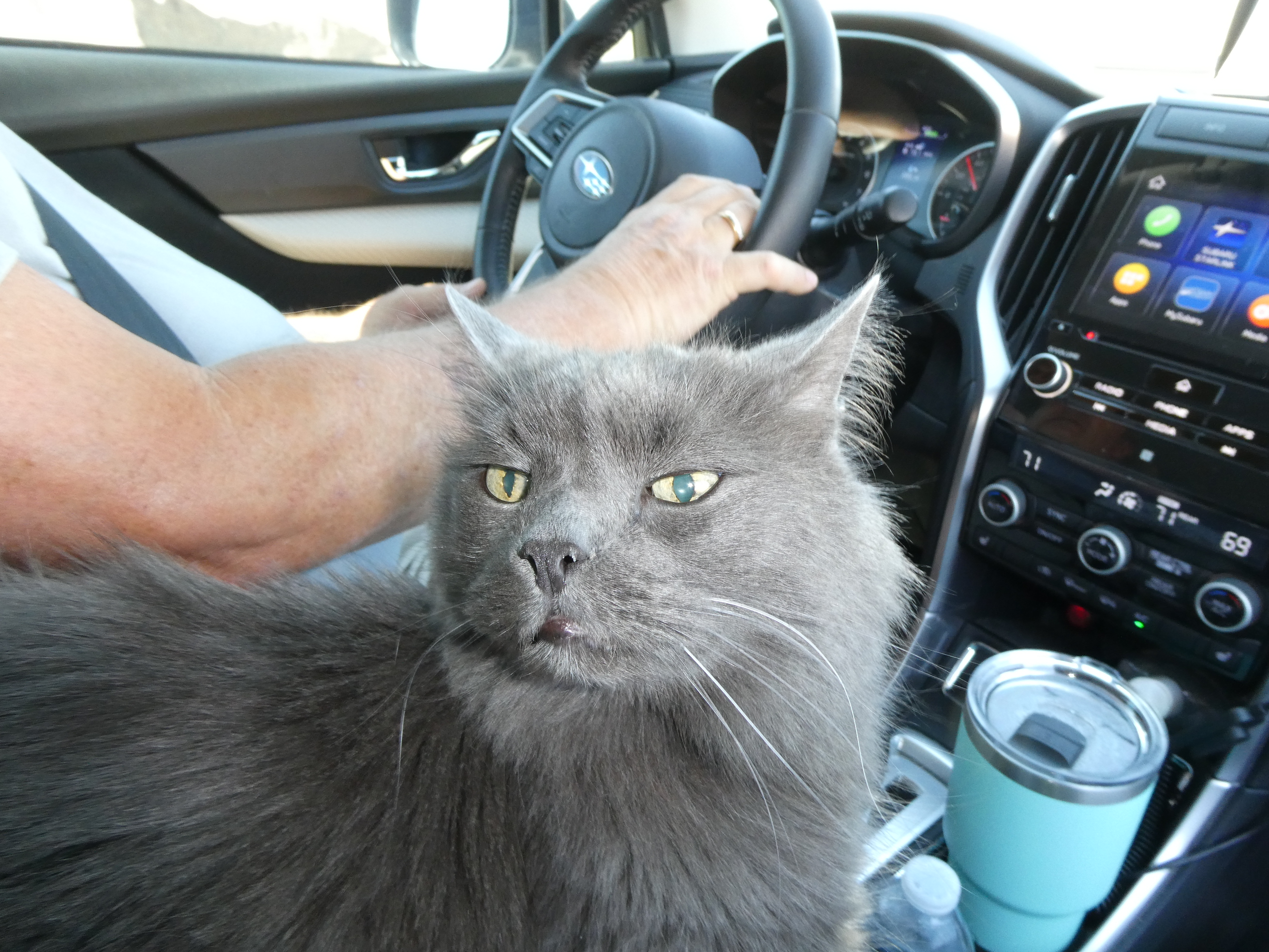 So we pull over to the side of the road to look for the kitten. Personally I think the bigger cat was trying to get rid of his new little sister. After searching all the spaces they thought the kitty could be, they went back in the motorhome and the kitten was sitting in my sister-in-laws seat. “Where were you mom? I’z just sittin here keeping your seat warm for ya”. Cute kitty….and then we were off again.